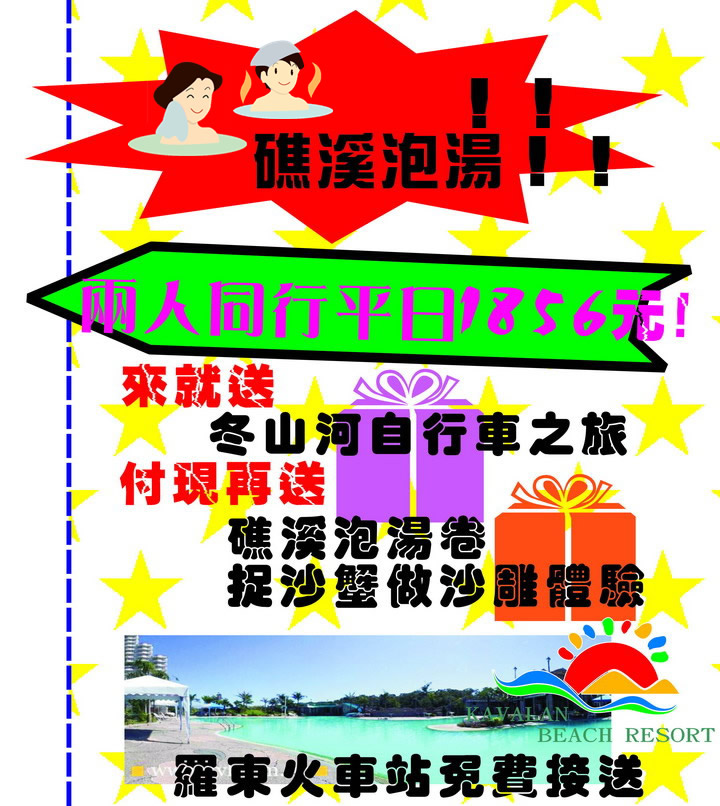付現金!超值大贈送!贈送超值門票 (3大主題公園任選1種參加) ※礁溪湯圍溝公園泡湯卷 耗資新台幣九千多萬建設, 檜木挑高溫泉浴池。 ※武荖坑風景區門票 綠色博覽會會場,武荖林泉堪稱蘭陽第一林泉。 ※冬山河親水公園門票 國際童玩節會場,宜蘭第一風景區。 PS.以上行程自行前往,若需接送酌收車資 贈送捉蟹沙雕體驗 (下午4點出發)